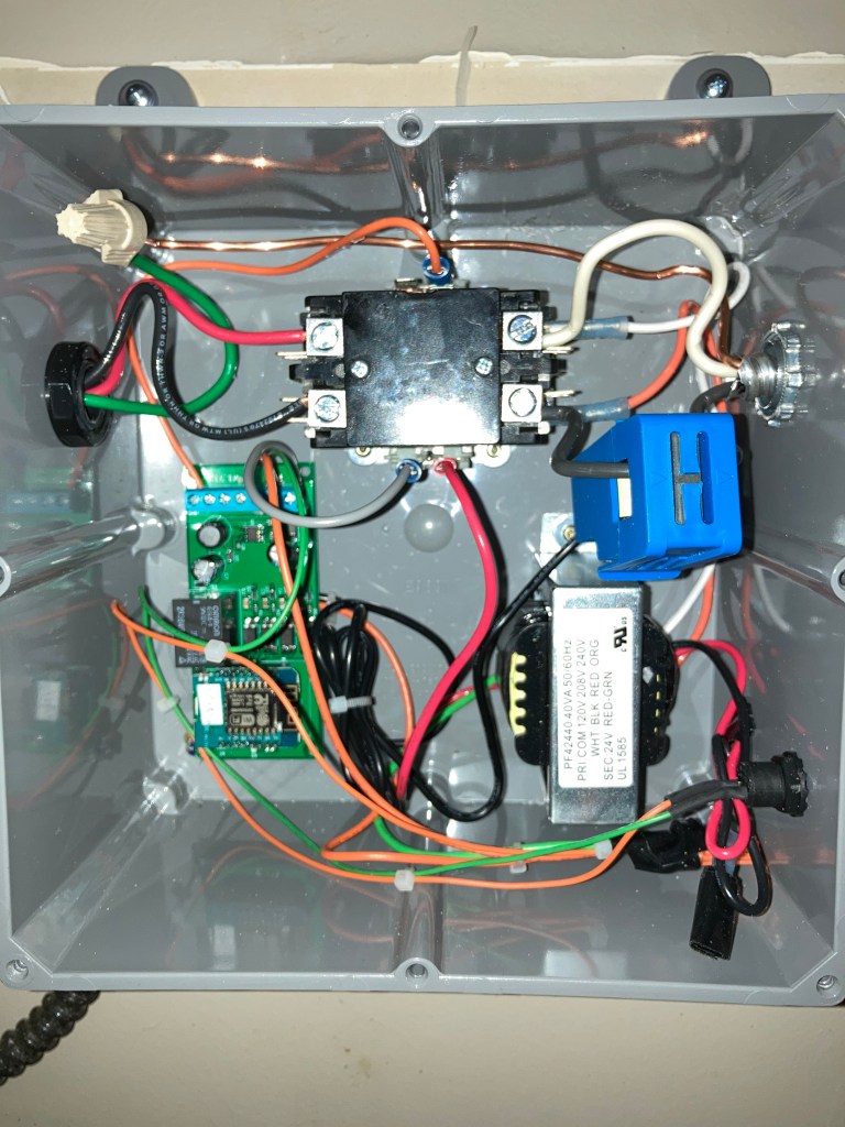 This project again uses the ESP8266 and ESPHome. Rather than design a new circuit board, I’m using an extra board from my HVAC monitor project. A 240V to 24V transformer is the power source for the HVAC monitor, and a relay on that board controls the 24VAC to engage the contactor. So we have a small relay controlling what is effectively a bigger relay. I mounted everything in a nice big plastic electrical box, which ironically was the most expensive part of the project!